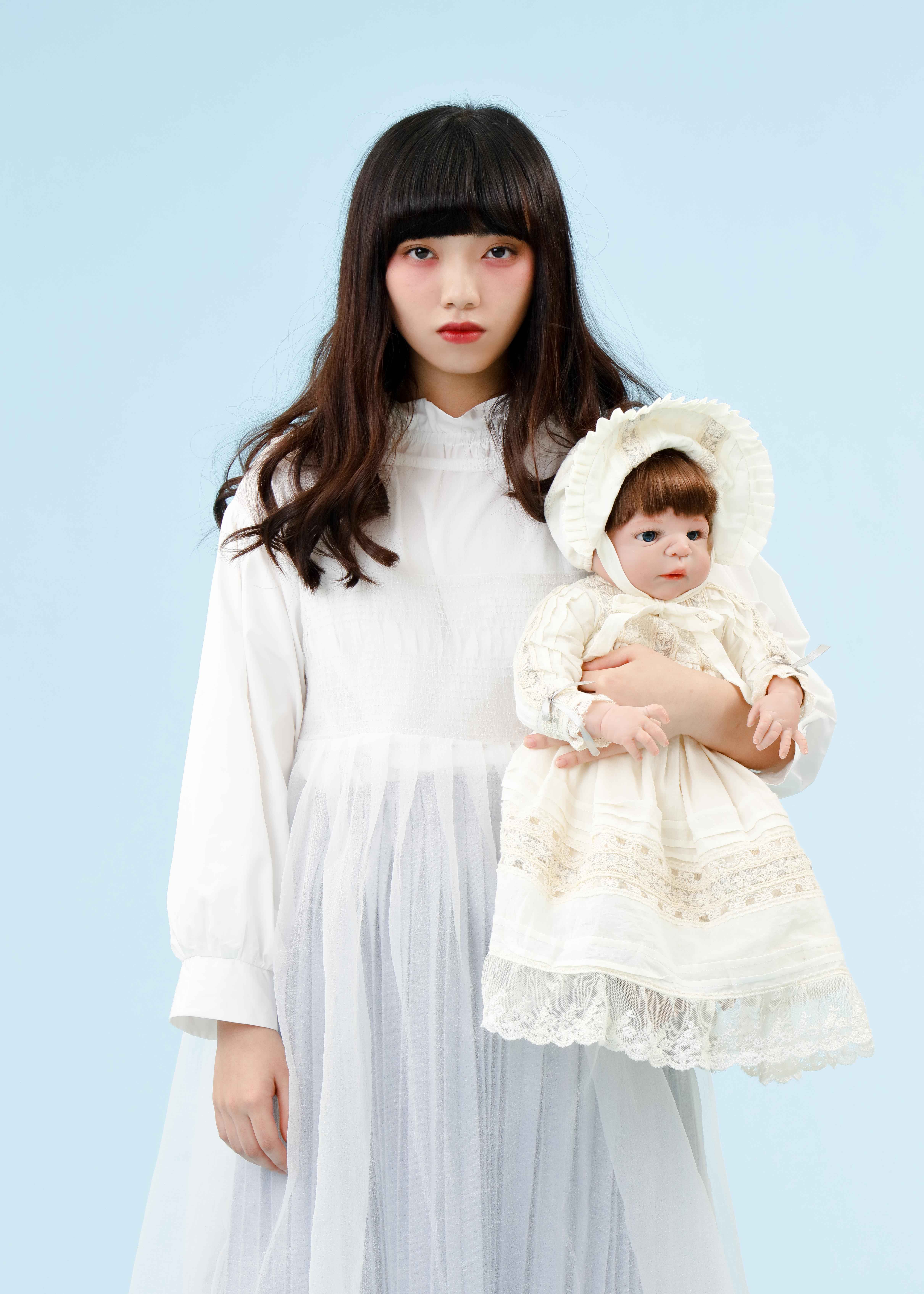 Using different fabric manipulation techniques, this collection includes smocked dresses, pleated skirts, and collars and edges with scalloped detail. For colouration, warm grey, ash blue in a pastel palette, and white were used. Fabrics include peached cotton, wool, corduroy and cashmere- acrylic knit, which create comfort and softness.